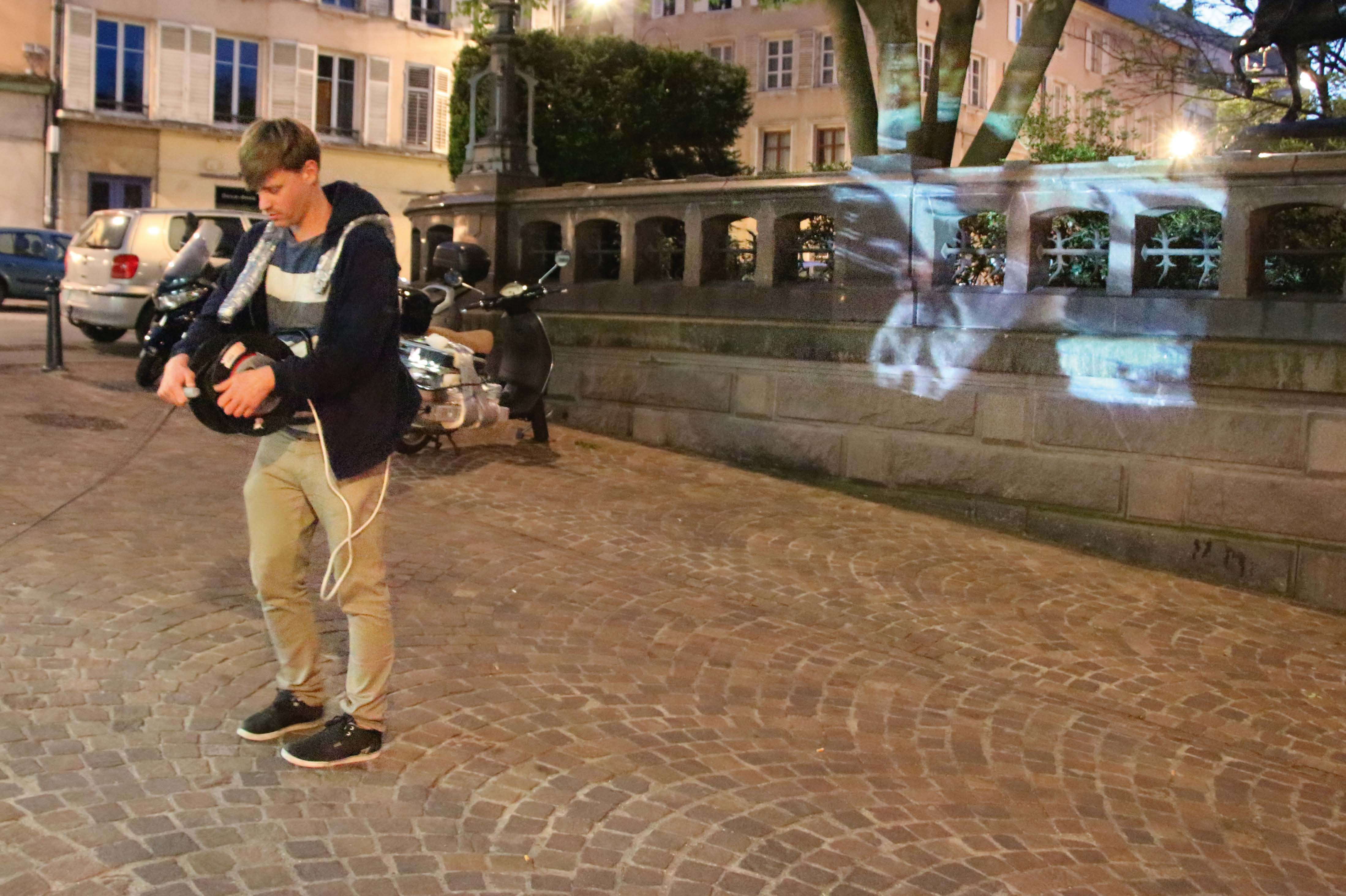 Video: A street musician from San Francisco is pored over in his violin playing. The strings of his violin are torn or stretched. So we hear a very rough materialized sound. The recorded video is played at half speed to bring the harsh materialized sound into our focus. Performance: The mobile video-projection in public space offers a different view of an everyday situation. The urban passersby and the architecture becomes the projected surface.
