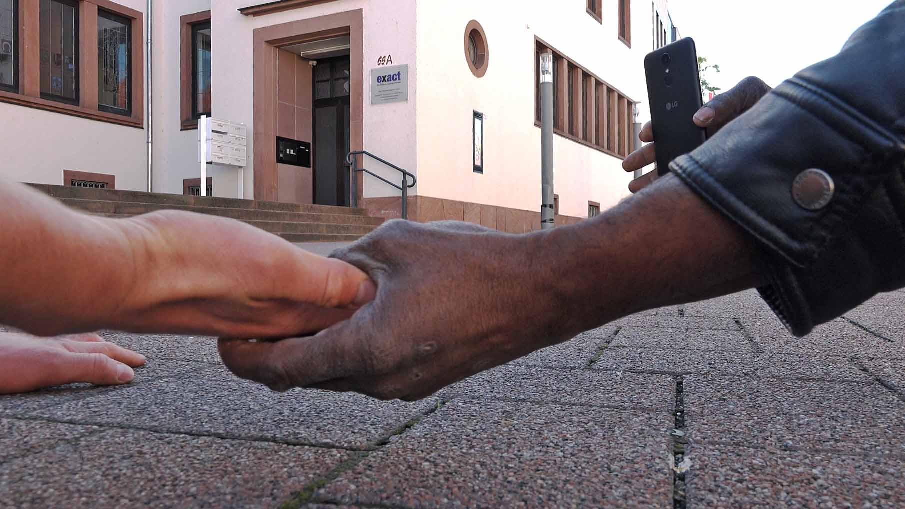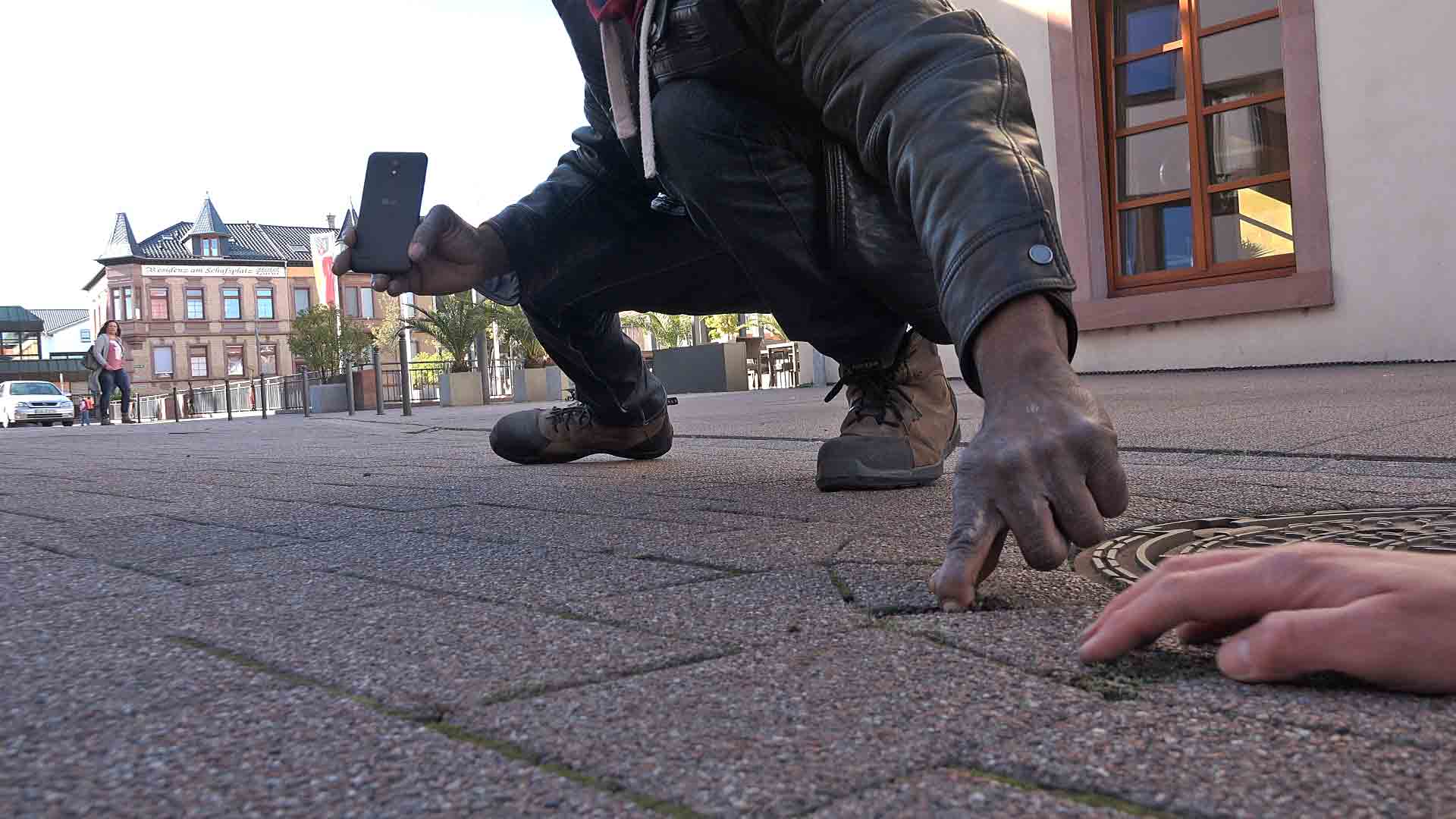 I am lying on a hand truck by which I am able to use the cobblestones on the ground as holds to climb the path in front of me. The perspective of my camera, which I pull beside me as a climbing partner, shows the path in front of me as a wall, which I am ascending. I am transferring the heroic myth of the Eiger north face into the center of the village of Edenkoben by this irritating action. Random passersby ask me, what I am doing. We strike up conversations about possibilities and impossibilities, meaningful and senseless, absurd actions.