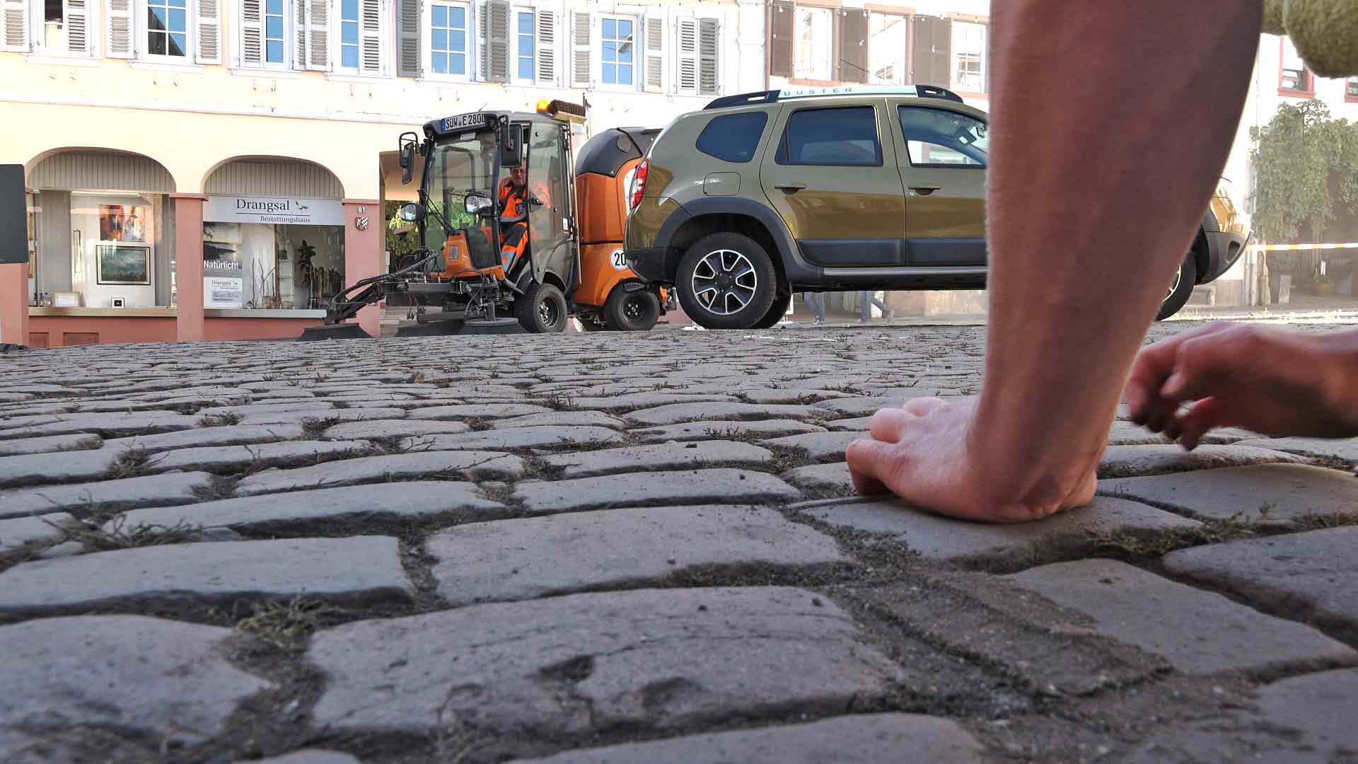 Durch die Lagerung meines Körpers auf einer Sackkarre bin ich in der Lage, horizontalen Untergrund wie eine Bergwand zu besteigen, indem ich mich mit meinen Händen über den vor mir liegenden Steinboden ziehe. Aus der Perspektive der Kamera, die neben mir liegt, und die ich Stück für Stück wie einen Kletterpartner weiter zum anvisierten Gipfel ziehe, kippt jedoch die Horizontale zurück in die Vertikale: Die Menschen um mich herum scheinen eine senkrechte Kletterwand hinaufzulaufen. So verbindet sich vor den Augen der zufälligen Passanten die ermüdende Monotonie des Alltags mit dem heldenhaften Mythos einer Bergwandbesteigung im Zentrum einer Kleinstadt. Die ausgelöste Irritation des Sichtbaren führt dazu, dass sich zufällige Passanten der unbekannten Situation nähern. Zwischen uns entspinnen sich Dialoge über das Mögliche und Unmögliche, Sinnvolles und Sinnloses.