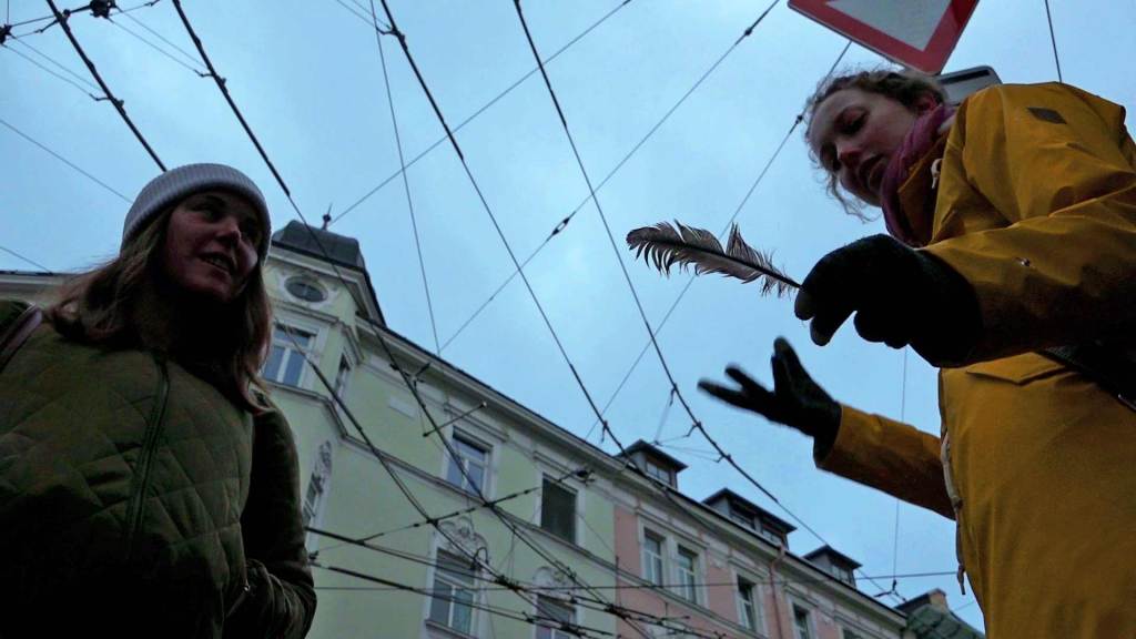 Ich liege auf einem Rollbrett und bewege mich fort, indem ich mich mit der linken Hand immer wieder vom Boden abstoße. In der anderen Hand halte ich eine Kamera. Was wir auf dem Video sehen, ist eine Feder, die sich fliegend, schwebend und rutschend auf dem steinernen kalten Untergrund des Salzburger Hauptbahnhofs fortbewegt. Der Sound verrät uns, dass ich die Feder durch meinen eigenen Atem Stück für Stück weiter zum Ende der Unterführung des Hauptbahnhofs, in einen Aufzug nach oben und anschließend durch die Stadt Salzburg bewege. Die eigentlich sehr anstrengende Handlung ist lediglich den Zuschauern und Beobachtern in Salzburg sichtbar, die sich dort zufällig zum Zeitpunkt der Performance aufhalten. So trenne ich in der entstandenen Videoarbeit die Ursache von ihrer Wirkung, weil nur noch die Fortbewegung der Feder zu sehen ist, jedoch nicht mein Pusten. Passanten um mich herum sprechen mich an und fragen, was ich täte. Ein Dialog über Mögliches, Unmögliches, im öffentlichen Raum Verbotenes und nicht Erlaubtes entspinnt sich zwischen mir und den beobachtenden Personen. Von Zeit zu Zeit werden diese sichtbar und zu Akteuren im Video, wenn sie die Feder aus aussichtslosen Situationen, zum Beispiel aus einem Gitter, herausziehen und mir zurück auf den vor mir liegenden Weg legen.