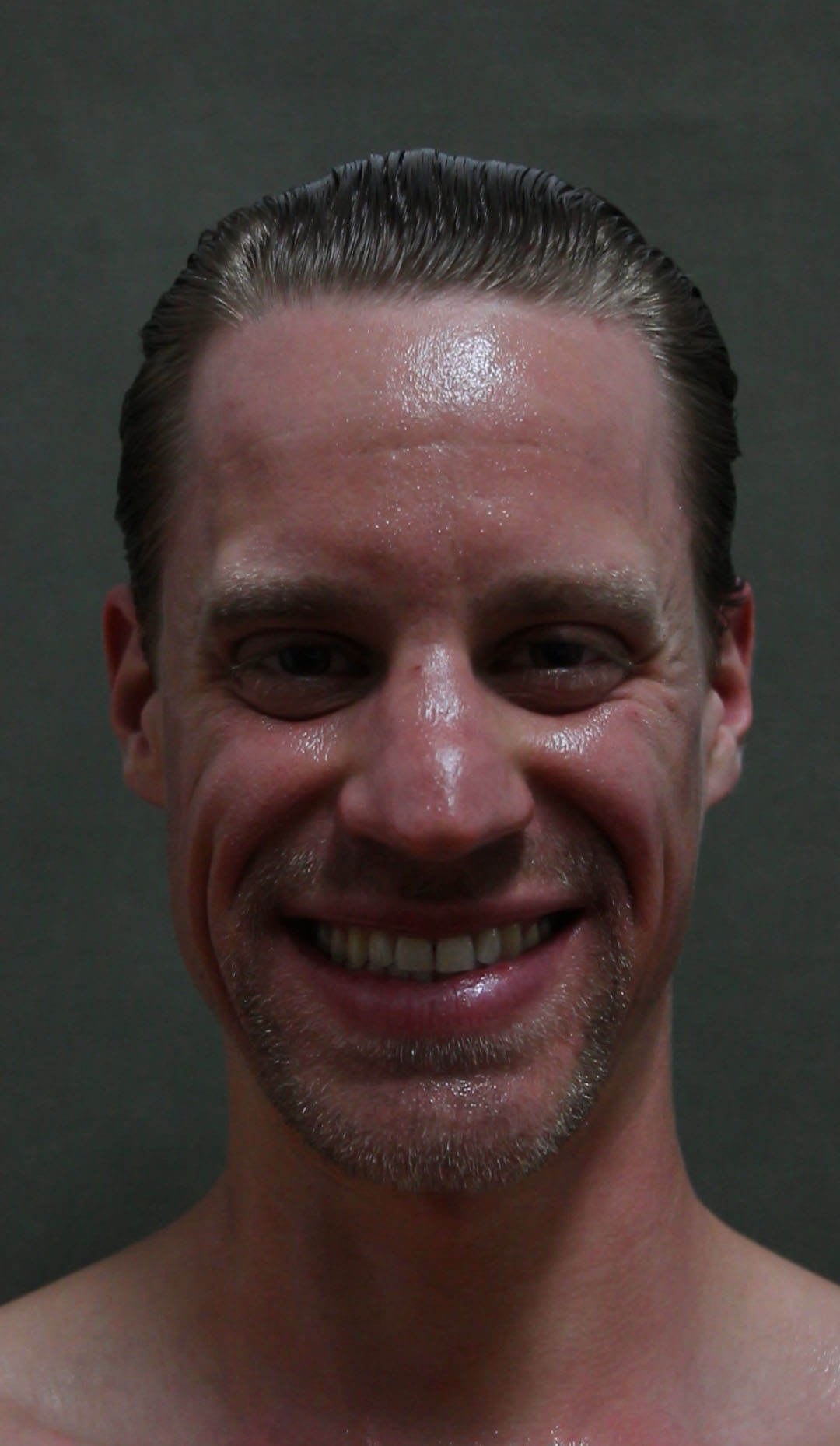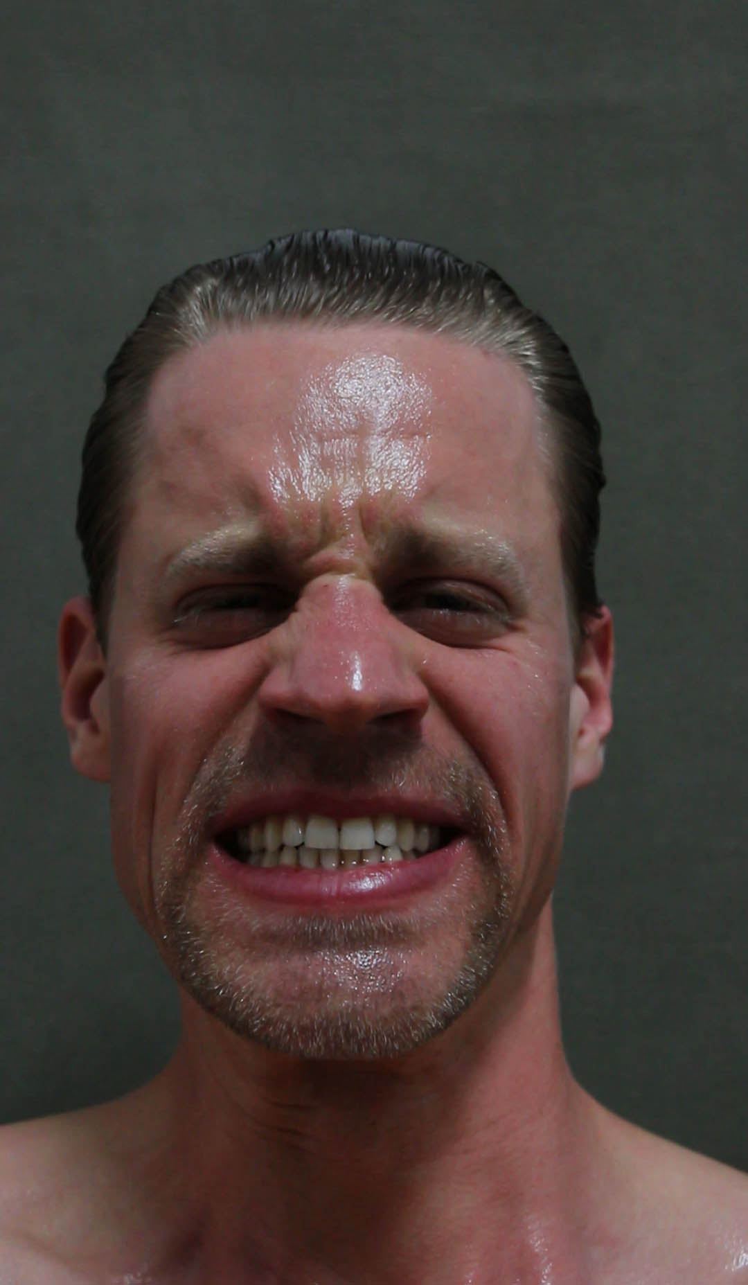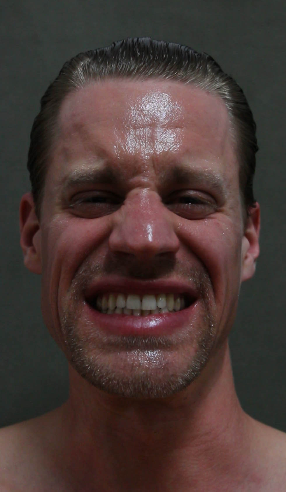 The entire physiognomy of the face is needed to smile. It is an expression of joy, and among other things serves to contact, but can also be used instrumentally, for example to enforce your own needs. The beginning of this work is an attempt of a smile sincerely meant. The face contorts gradually into a grimace. What should find expression as a sign of sympathy, is lost without a real counterpart. This leads on to a strenuous activity, which is clearly visible on my face.