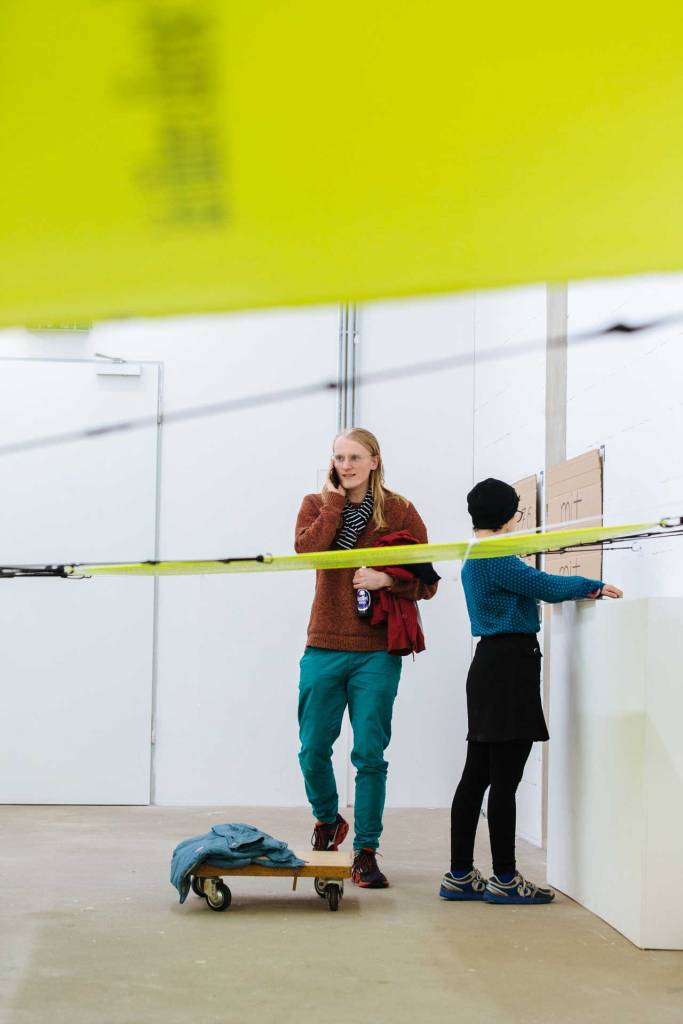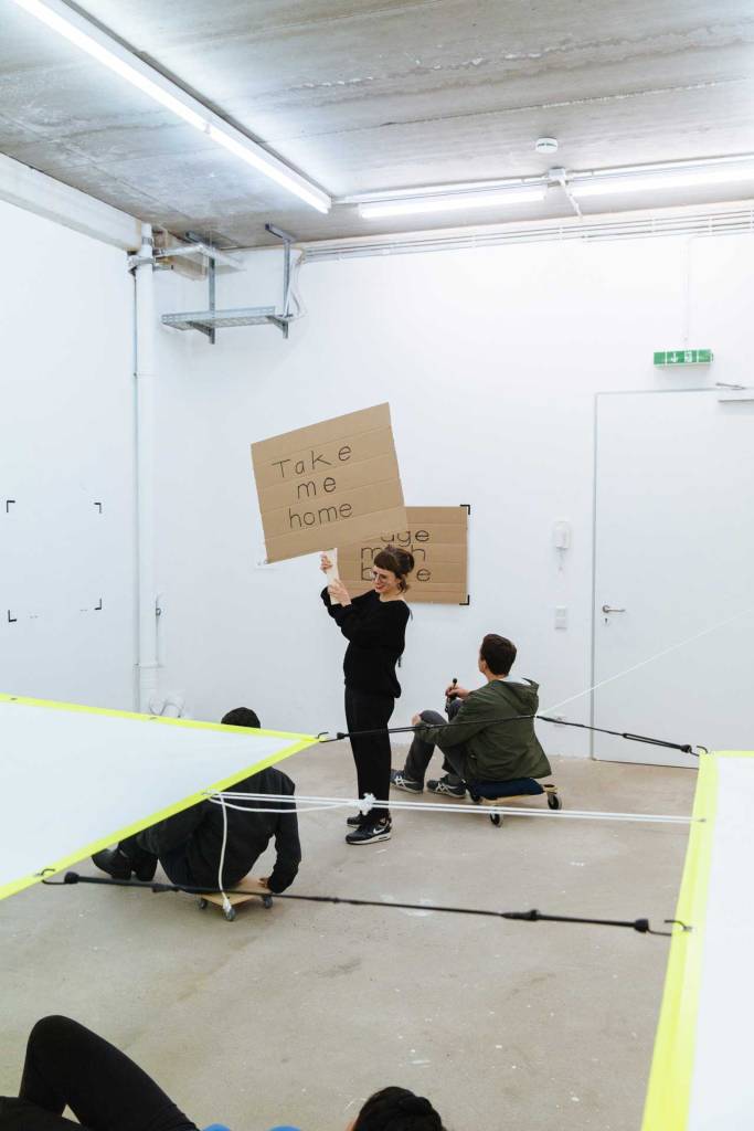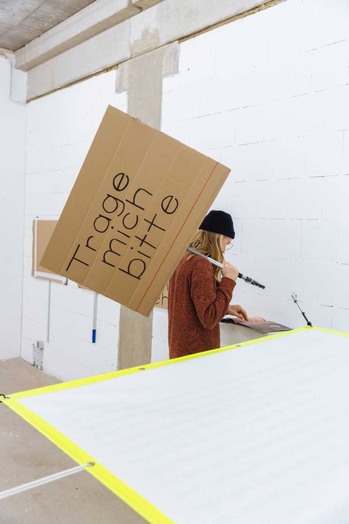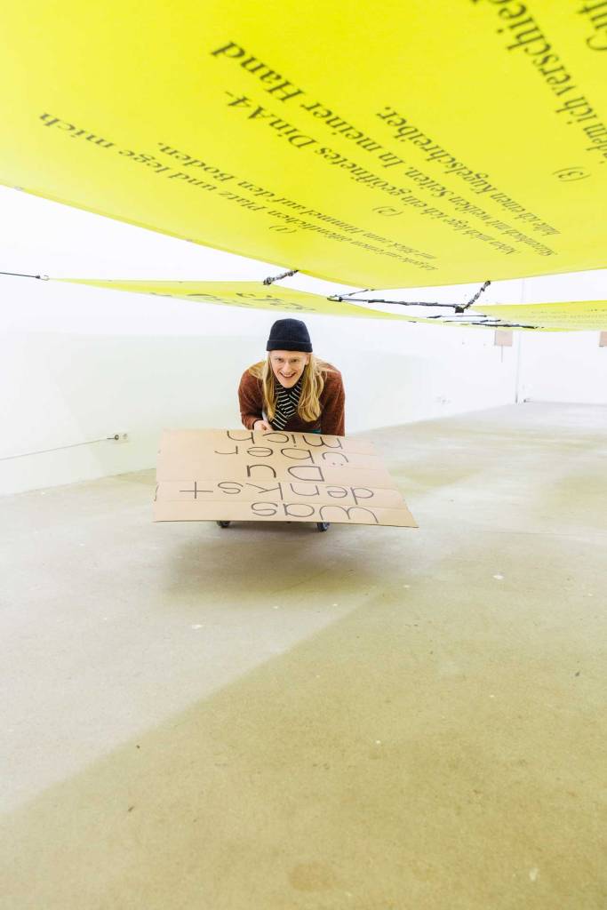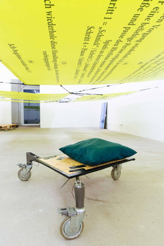 Die Ausstellung kann von den Besuchern nur betreten werden, indem sich diese auf Rollbrettern liegend durch den Ausstellungsraum rollen. Horizontal im Raum befestigte mehrere Meter breite und lange leuchtfarbene Banner, die auf einer Höhe von ca. 1,4 m gehängt sind, hindern die Besucher daran, die liegende Position zu verlassen. Auf den Bannern sind Handlungsanweisungen beschrieben, die die Besucher wiederum dazu aufrufen, nach dem Verlassen des Ausstellungsraums im öffentlichen Raum selbst aktiv zu werden. Der Titel der Intervention entspricht der Telefonnummer der Kuratorin, die mich für diese Einzelausstellung auswählte: Julia Katharina Thiemann.