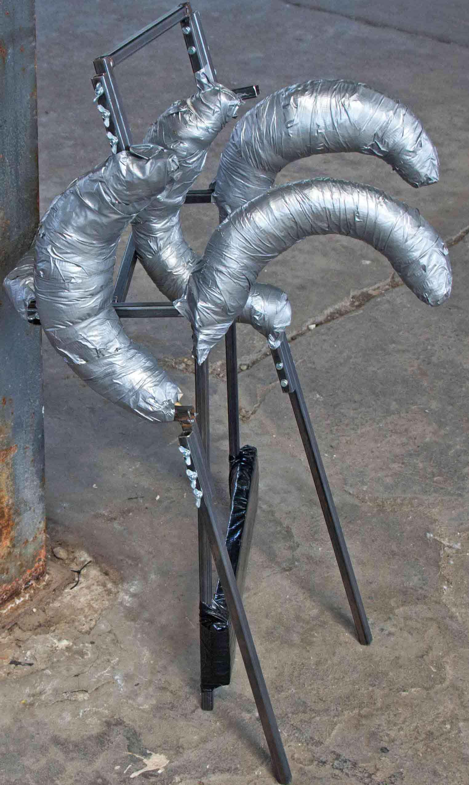 Sculpture (steel, stainless steel, tape, people) and multi-part performance/ 1. The storage condition: during this the sculptures lean against a wall andwait to be used. 2. The plot: two people keep using the metal frames, a third person is between them. The actor in the center is not at the mercy of the other actors, but in turn has of control over the situation: the sculpture is completed only by the presence of all actors as a whole. The performance is repeated at different locations.