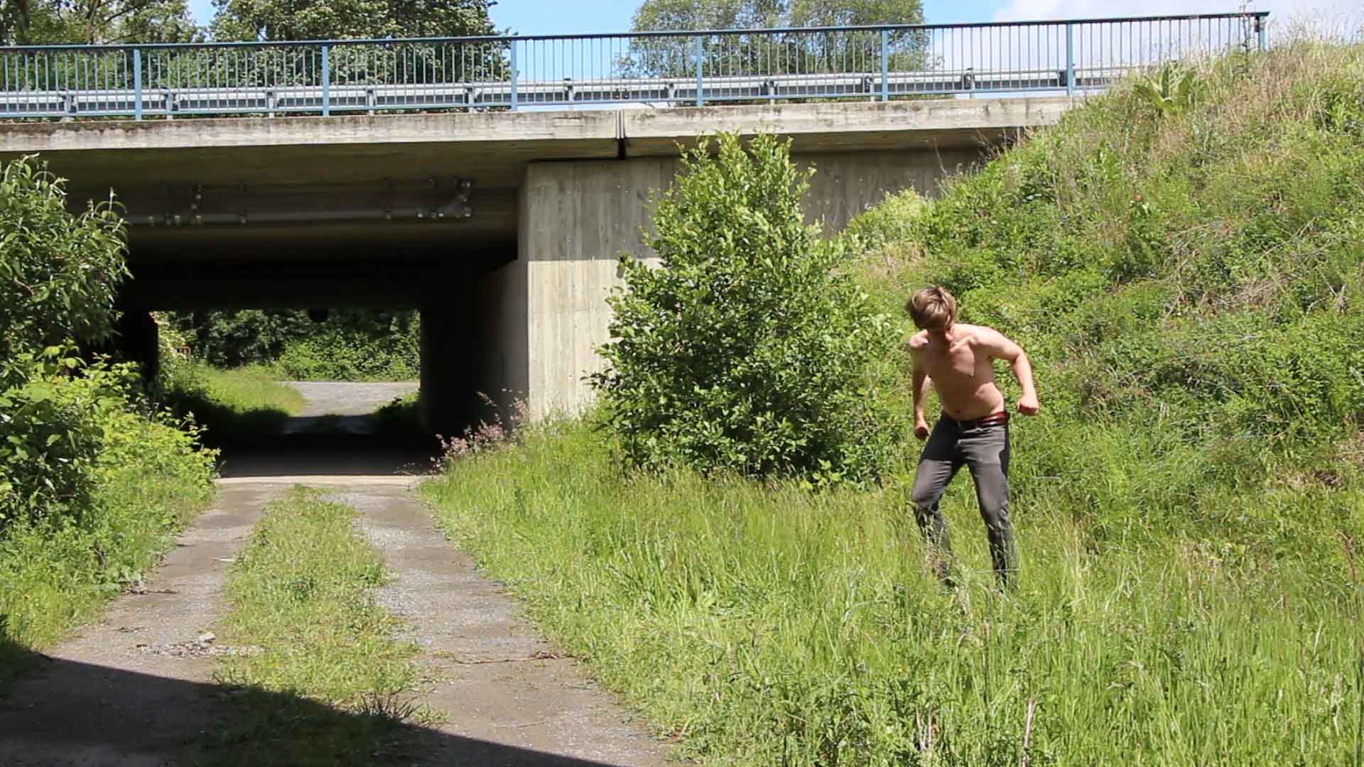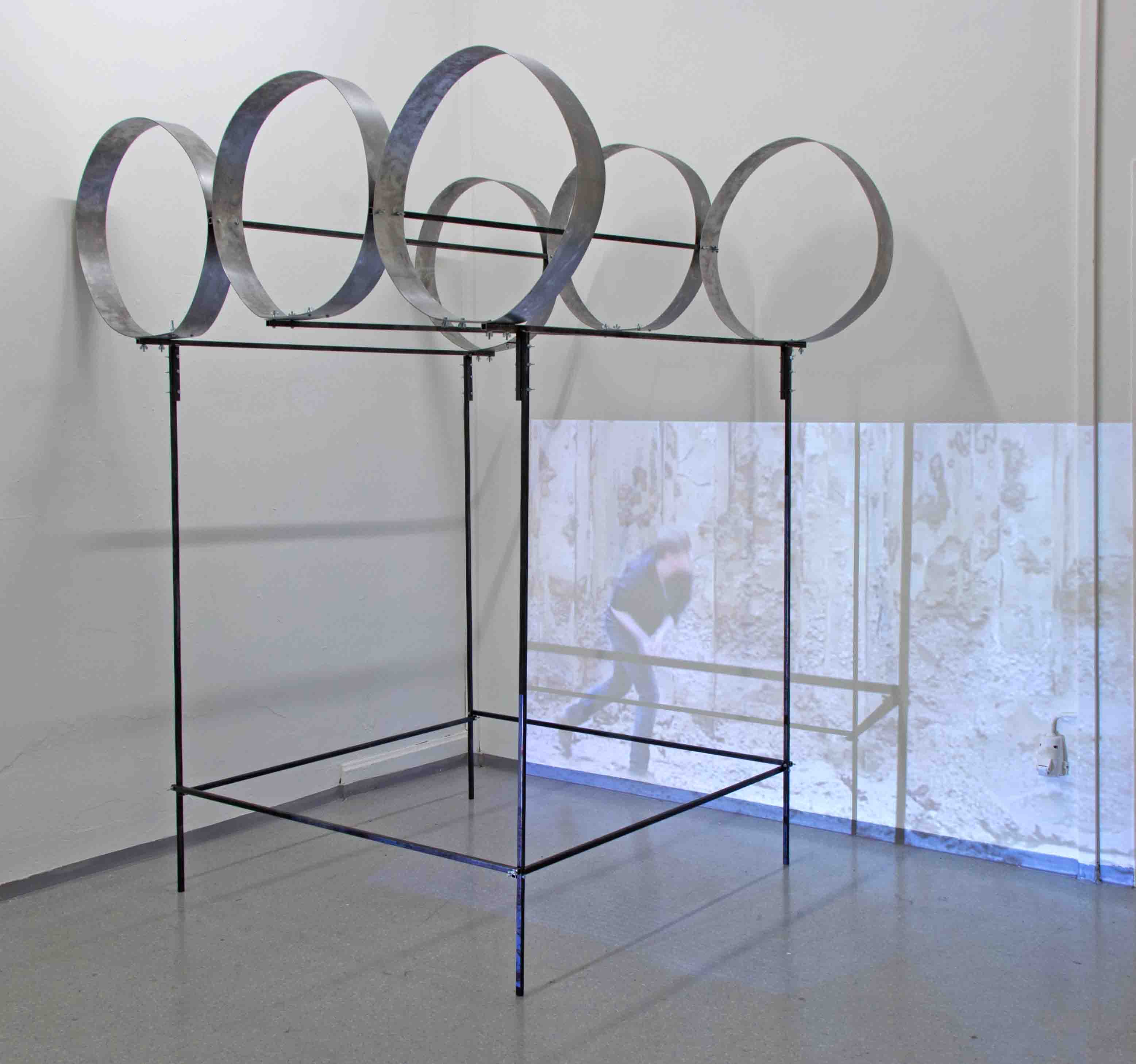 I turn a six meters square metal rod into a circle. In an almost one hour-long process I reduce the radius of this circle as far as the material itself, my strength, and the given circumstances admit. The plot ends when my sweaty palms lose grip on the metal rod. I fix the situation after the performance with tape. Thus the created object is merely the outcome of the action.
