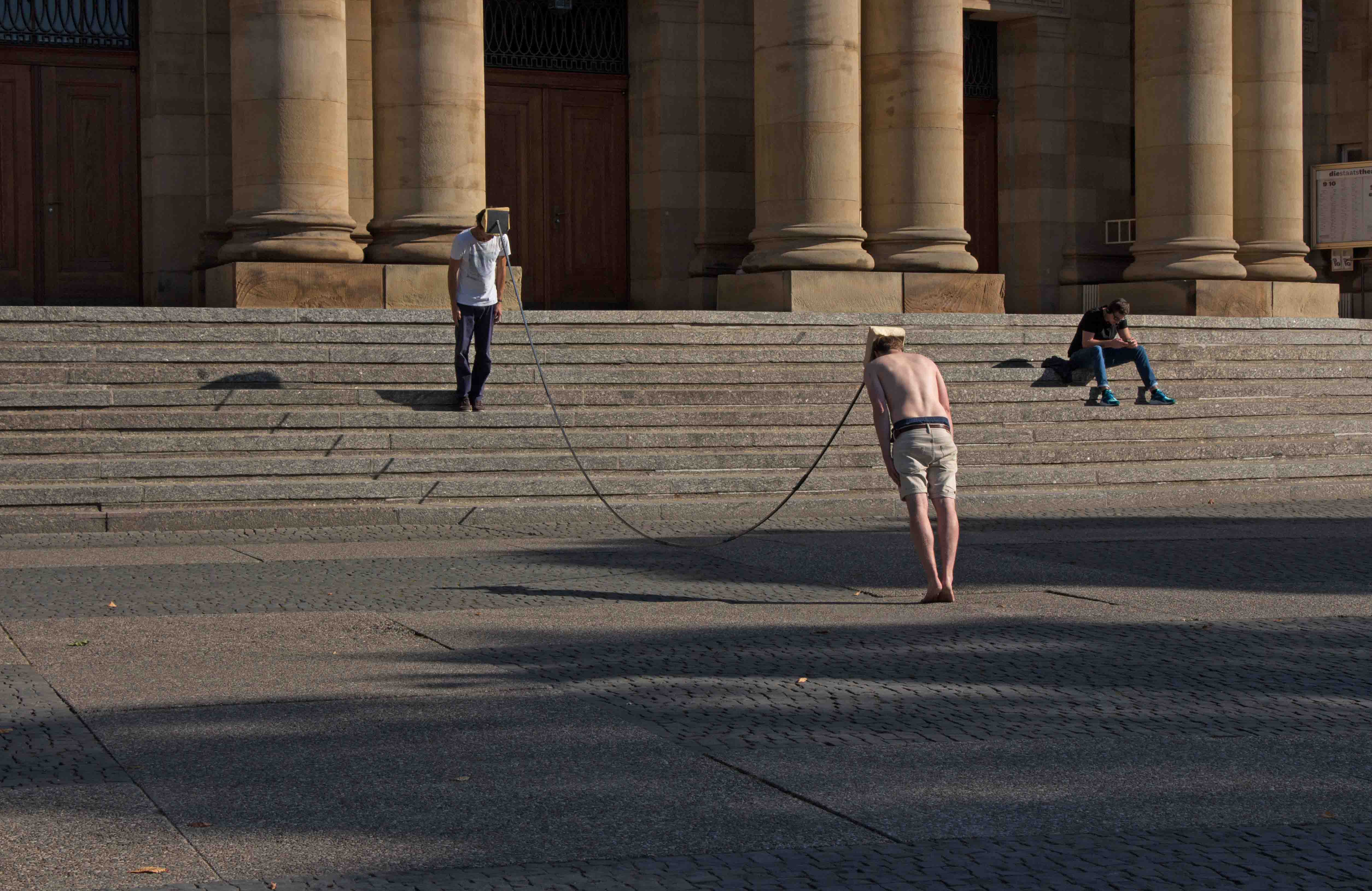 Volition # 10 Thursday, December 04, 2014 around 13.00 clock, Freiburg/ We fix small metal plates under our soles with tape. In this way the actors produce a clearly audible noise during their walking: metal on cobblestone. The aim of the action is the coming together of the different actors who accompany each one passerby. >read more<