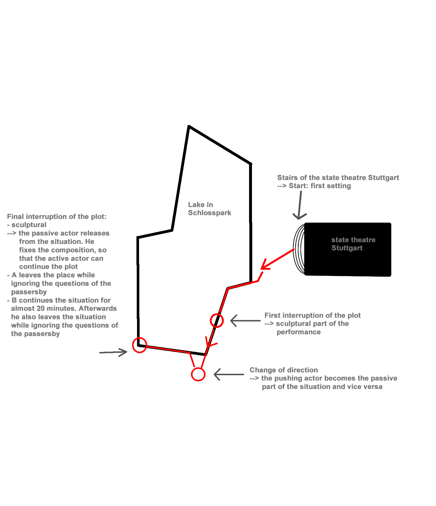 One-hour performance, October 19, 2013/ The two groups keep eye contact for 60 minutes, each lying actor to the standing actor. The standing actor doen´t respond to questions or other contact attempts from outside. The lying actor reacts only by writing or drawing into the lying A4 booklet. Here he/ she documents his/her experiences and observations without losing eye contact to the standing actor. >read more<